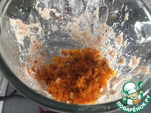 В чашу блендера добавить мясо курицы, зажарку, йогурт, специи и измельчить.