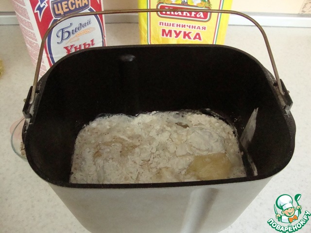 Загрузить в ведерко хлебопечки ингредиенты согласно инструкции. У меня сначала сухие, затем жидкие.