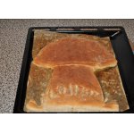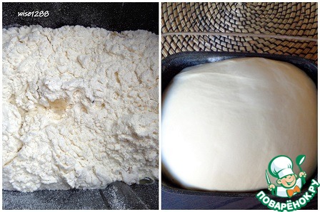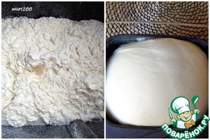 Приготовить тесто: соединить сухие ингредиенты, добавить растительное масло и воду. Замесить тесто и поставить в теплое место на 40 – 60 минут. Я воспользовалась хлебопечкой. Ингредиенты поместила в ведро хлебопечки – сначала сухие ингредиенты, потом жидкие. Тесто было готово через 45 минут. Дополнительно тесто расстаивалось в теплой хлебопечке 15 минут.