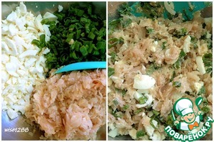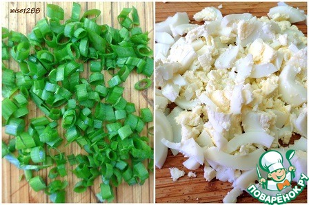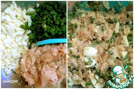 Для приготовления начинки соединить капусту, яйцо, зеленый лук, посолить. Перемешать до однородности.