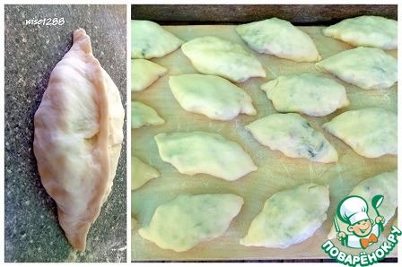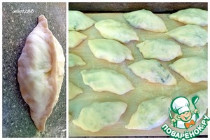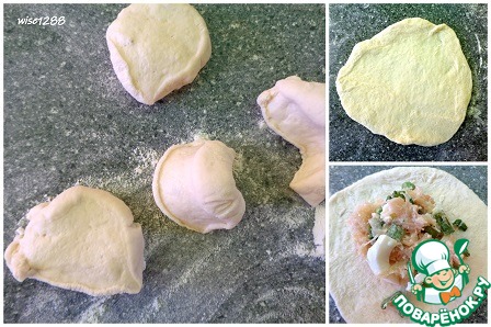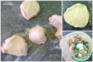 Из теста сформировать 20 заготовок для пирожков, каждую часть теста тонко раскатать, подпыляя рабочую поверхность мукой. В середину положить начинку.