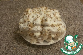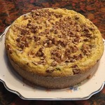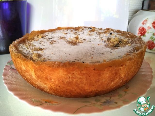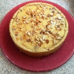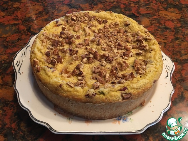 Тесто раскатать в пласт толщиной 5мм, перенести его в форму диаметром 20см и распределить по дну и бортикам. На тесто выложить манную начинку, разровнять. Сверху присыпать молотыми орехами или миндалем и поставить в духовку разогретую до 180 градусов на 40-45 минут. Доставать из формы полностью остывший торт.