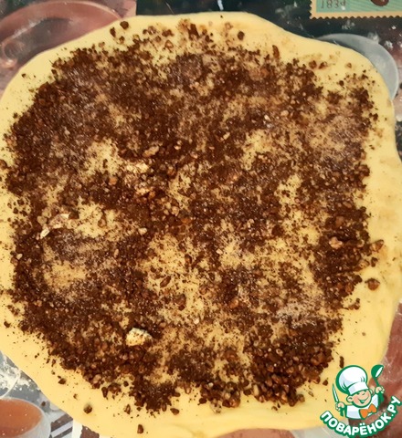 Раскатать тесто в пласт, распределить оставшееся сливочное масло по тесту, далее посыпать тесто орехами, какао и сахаром. Скрутить в рулет.