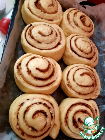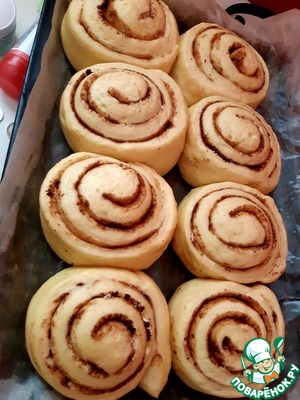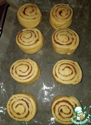 Нарезать рулет на булочки и оставить на расстойку в теплом месте ещё на 20-30 минут.