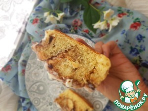 Готовые булочки обмазать сверху творожным сыром и шоколадным соусом.