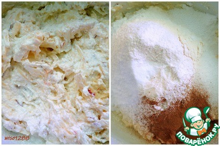 Перемешать и добавить муку, разрыхлитель, ванилин, корицу.