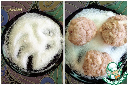 Духовку разогреть до 180 градусов. На тарелку насыпать сахар и обвалять шарики в сахаре.