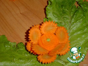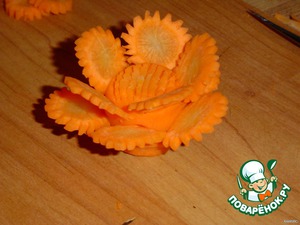 Такой цветок послужит вам отличным украшениям как для салатов, так и для основных блюд. А прелесть этого цветка состоит еще и в том, что его может сделать любой и для этого не потребуются специальные ножи.