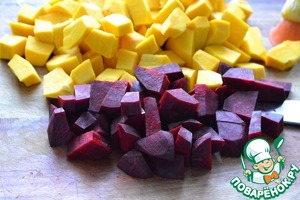 Свеклу почистить и нарезать на кусочки, которые меньше тыквенных