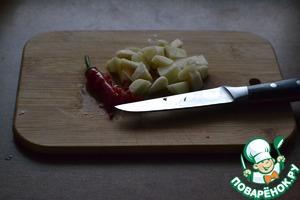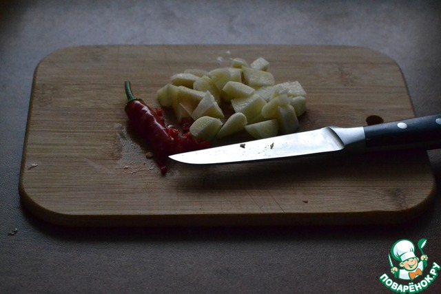 Нарезанные овощи выложить в глубокий противень. Добавит чеснок и чили.