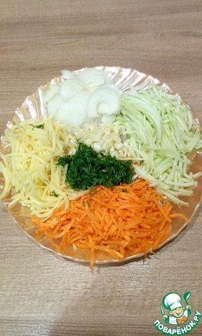 Морковь, картофель, кабачок натрем на крупной терке, лук нарезаем полукольцами, чеснок и укроп мелко измельчаем.