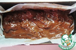 Выложить в форму (размер формы 9 см х 22 см; дно застелить пергаментом), разровнять. Отправить выпекаться в разогретую до 170 градусов духовку на 15-20 минут (готовность проверяем деревянной шпажкой). Готовый брауни вынимаем из духовки и разрезаем на кусочки.