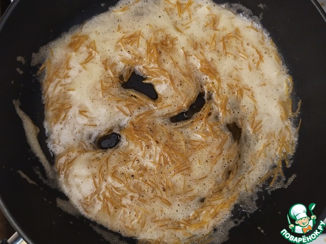 Постоянно помешивая, обжариваем вермишель до золотистого цвета.