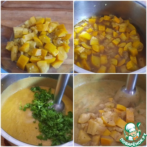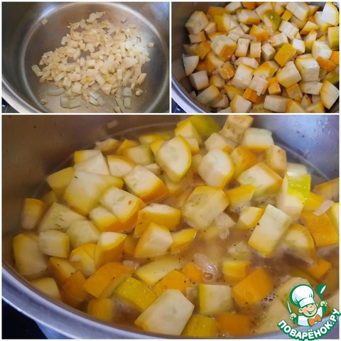Кабачок нарезать кубиками, добавить в кастрюлю, потушить 5 минут.