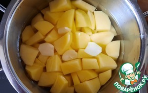 Картофель почистить, нарезать небольшими кубиками, чеснок почистить, разрезать пополам, отварить в подсоленной воде 20 минут.