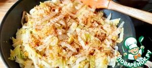 В сковороде разогреваем одну столовую ложку растительного масла, тушим пекинскую капусту в течение 10 минут под крышкой, изредка помешивая.
