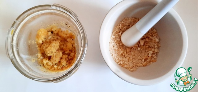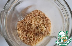 Орехи измельчаем удобным вам способом, смешиваем с хлебно-масляной крошкой. -