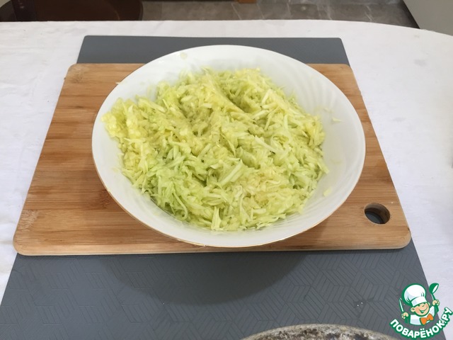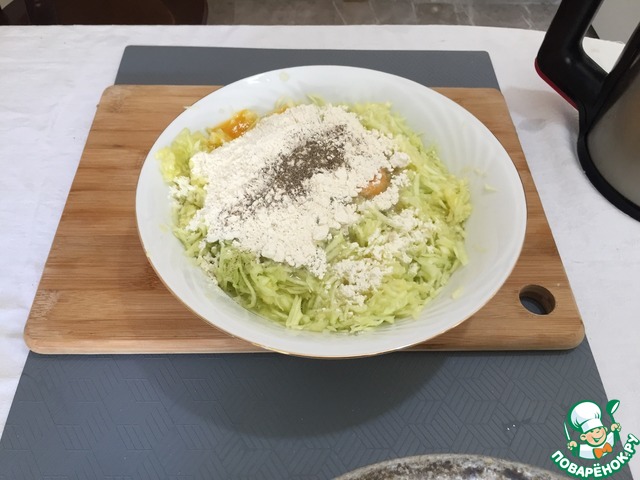 К натертым кабачкам добавить яйца, муку, специи. По необходимости немножко воды.