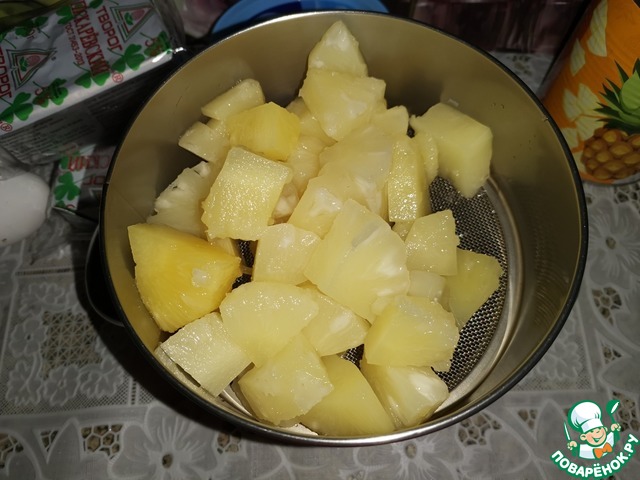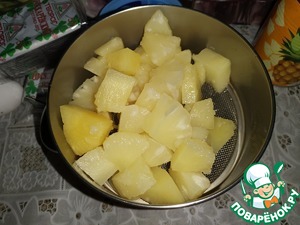 Слить ананасовый сироп в кастрюльку. Ананасы пюрировать.