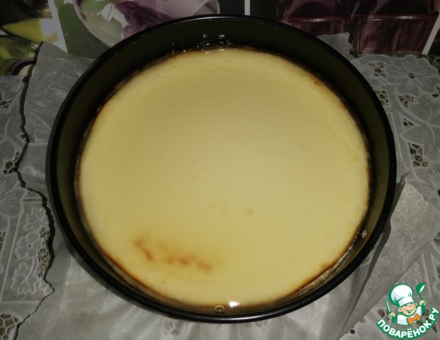 Творожник оставить остывать при комнатной температуре, затем верх формы накрыть фольгой или пищевой плёнкой и убрать в холодильник для стабилизации минимум на 2 часа, а лучше на 6-8 часов.