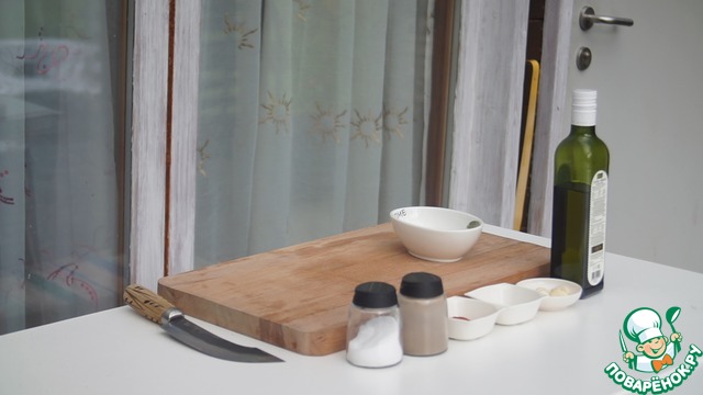 Приготовить маринад. Для этого смешать чеснок и сухие специи, а затем довести оливковым маслом до состояния густой пасты.