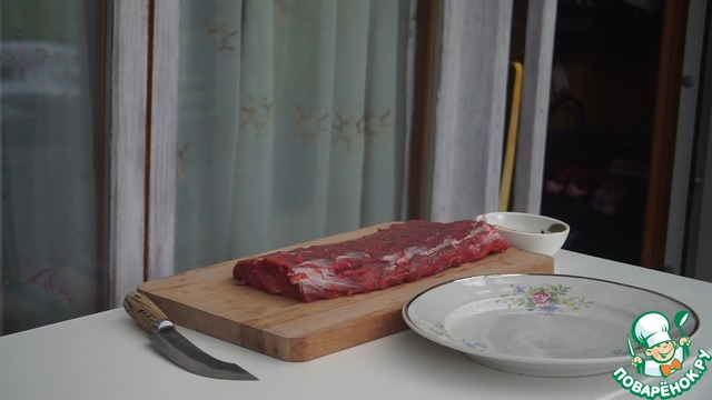 - Говядина (Для этого блюда берется отруб, который у нас известен под названием: тонкий край. В классической школе называется стриплойн.) — 2 кг