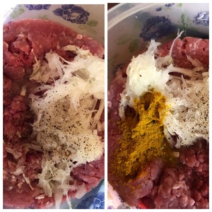 К фаршу добавить чеснок пропущенный через пресс и лук натёртый на крупной тёрке. Всыпать соль, перец и карри. Перемешать фарш.