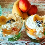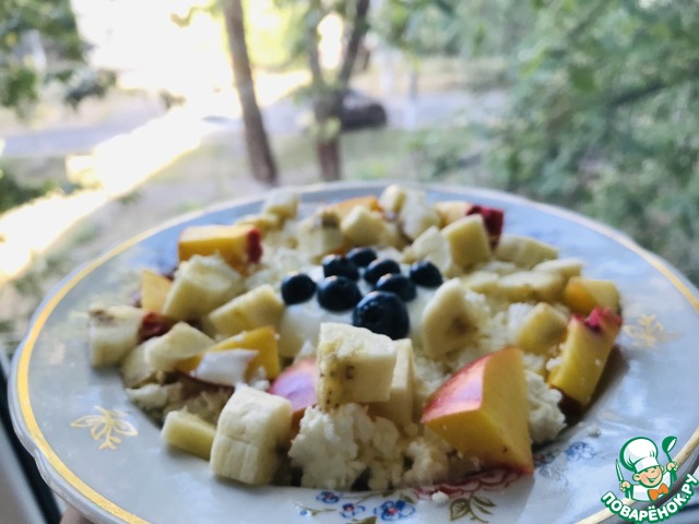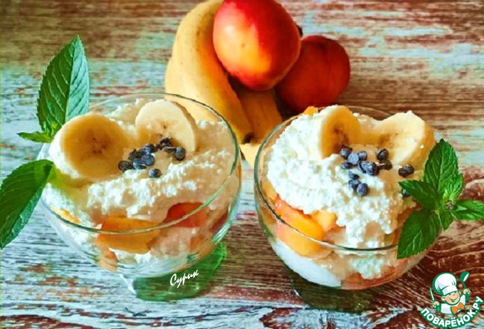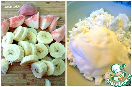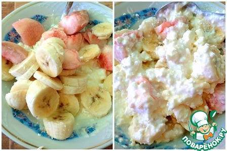 Персик и банан нарезать небольшими кусочками. Творог соединить со сметаной.