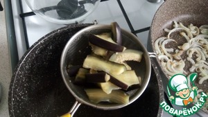 Готовые баклажаны отправляем в сито и немного отжимаем их ложкой