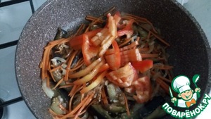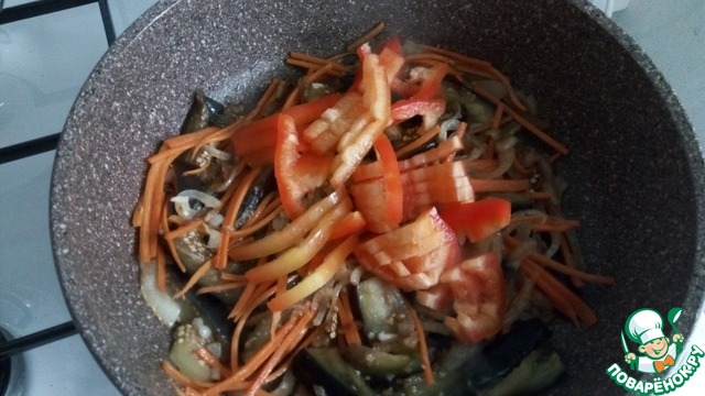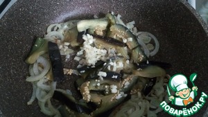 Отправляем их к репчатому луку, еще чеснок и все это перемешиваем и даем соединится минуты 2, такие баклажаны не впитывают в себя масла и многим это понравится