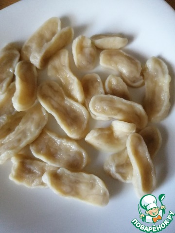 Замесить тесто как на пельмени, сделать галушки и отварить их в подсоленной воде.