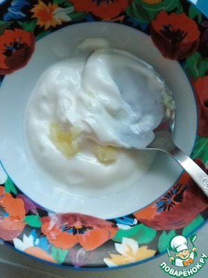 В это время натереть дольку чеснока и смешать с йогуртом.