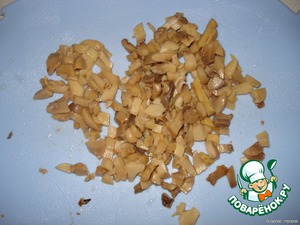 Мелко порезать грибы. Выложить в сковороду грибы и сосиски. Поставить жариться.
