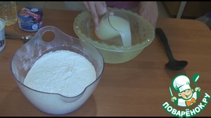 В миску нальем теплую воду или сыворотку или молоко. Добавим соль, сахар, размешаем.