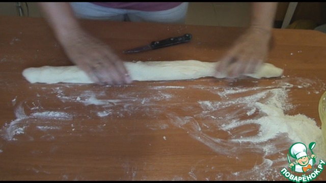 Достаем тесто, отрежем небольшой кусок и раскатаем колбаской. Колбаску можно делать тоньше или толще, на ваше усмотрение. Отрезаем ножом небольшие кусочки и выкладываем на смазанный растительным маслом противень.
