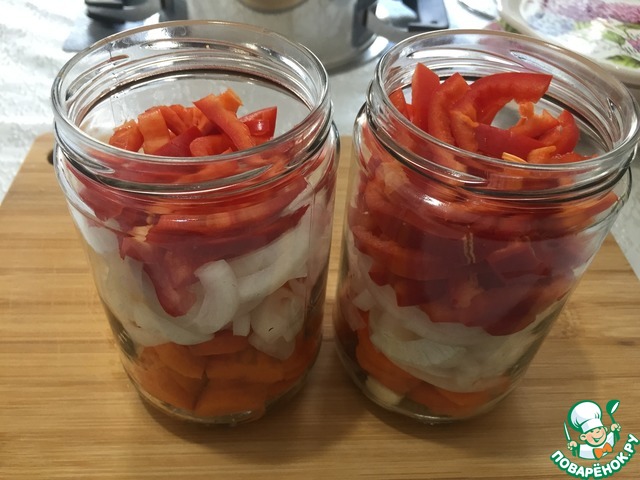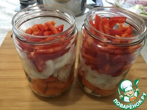Морковь нарезаем колечками. Репчатый лук нарезаем полукольцами. Болгарский перец нарежем брусочками. |
