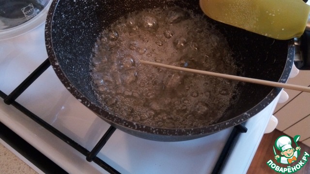 Окунаем шпажку в сироп и быстро погружаем ее в ледяную воду. Если услышали шипение карамели в воде, а вытащив из воды карамель превратилась в твердый шарик который не мнется и не липнет, значит карамель готова. Если шарик еще липнет или мягкий, продолжаем варить карамель