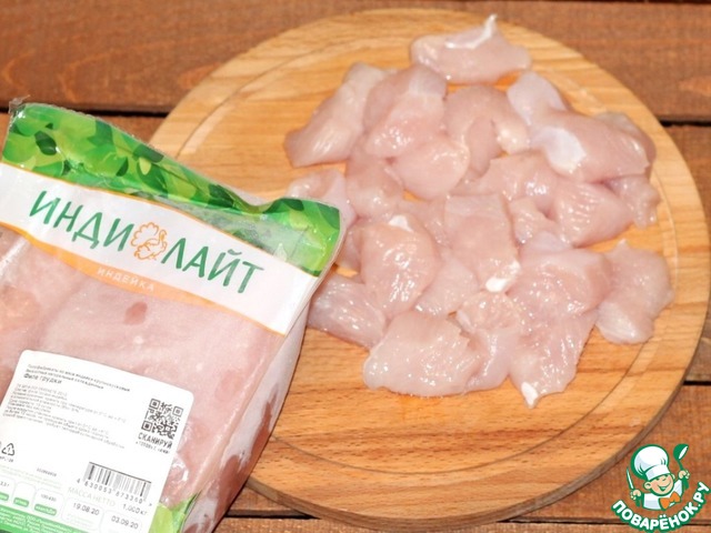 1. Филе индейки нарезаем порционными кусочками, 3*4 см.