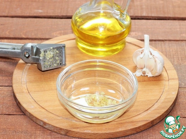 2. Очищаем чеснок и пропускаем через давилку. Заливаем чеснок растительным маслом, перемешиваем и оставляем в сторону на полчаса.
