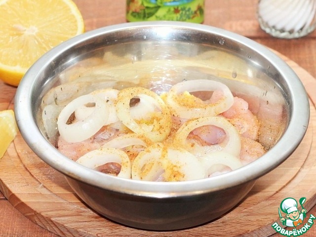 4. Выкладываем в миску кусочки мяса и лук. Добавляем лимонный сок (0, 5 лимона), приправу для птицы, перец и соль. Выливаем чесночное масло и хорошенько перемешиваем. Убираем миску с шашлыком в холодильник.