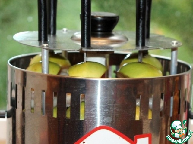8. Я готовила в электрошашлычнице. Очень удобно, смазывать шашлык не надо. Яблочный сок стекает из печеных яблок на мясо и увлажняет его. Если у вас такая же шашлычница, то дольки яблок должны насаживаться как у меня. Для того, чтобы яблочный сок стекал на мясо.