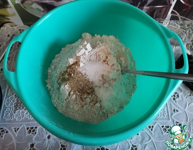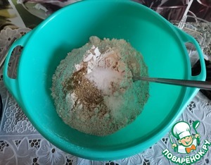 Всыпать в чашу все сухие ингредиенты: муку пшеничную, муку ржаную, соль, сахар, молотый фенхель и перемешать. -