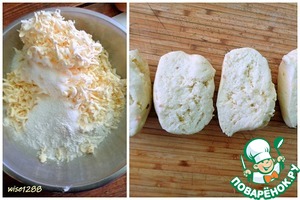 Творог и сливочное масло охлаждённые (из холодильника). Масло натереть на терке. Для приготовления теста соединить все ингредиенты. Замесить тесто, дать ему отдохнуть 20 минут в холодильнике. Поделить тесто на четыре части.