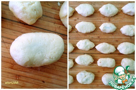 Каждую четвертинку теста поделить на пять частей, скатать колобочками. Из колобочка сформировать лепешку и положить фаршированный финик. Края защипать.