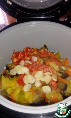 За 10-15 минут до окончания программы посолить, приправить специями (у меня только орегано и смесь перцев), добавить порезанные помидоры и чеснок. Я чеснок для этого блюда режу лепестками, нам так больше нравится.