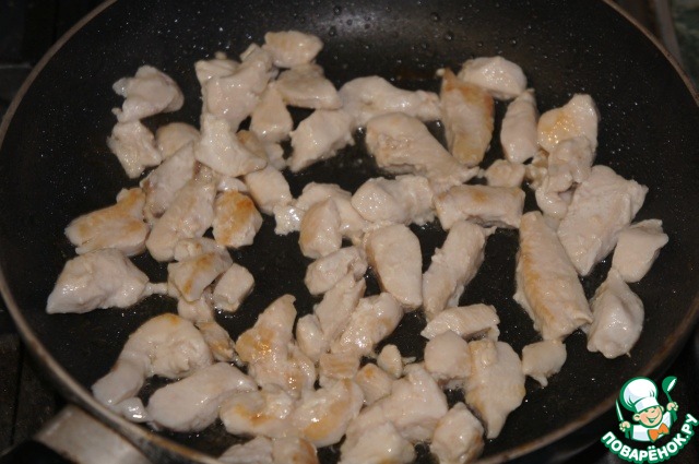 • Филе нарезать соломкой или кубиками и обжарить до легкой румяной корочки.