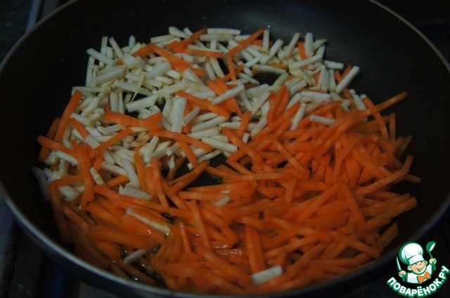 добавить морковь с сельдереем и пассеровать до полуготовности,