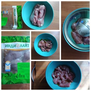 Я буду делать стейк-салат на двоих и для этого возьму бедро индейки ТМ ИНДИЛАЙТ. Вес упаковки у меня 410 г. Я использую половину. Нужно нарезать бедро на куски примерно по 3 см или как получится, но кусочки должны быть крупные. Маринуем мясо в сборе перцев, соли и оливковом масле. Добавлять больше ничего не нужно. Замариновать можно и на природе минут на 30, а лучше это сделать дома и привезти с собой. Хотя свежее мясо можно замариновать и почти сразу приготовить!