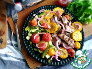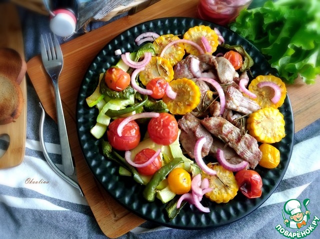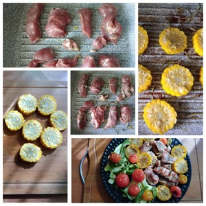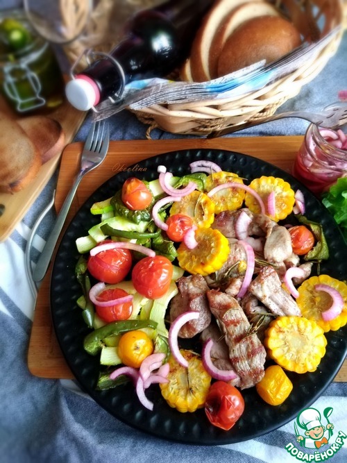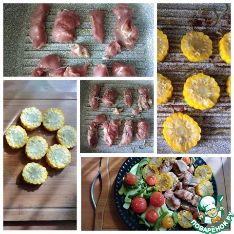 Замаринованное мясо готовим на сковороде-гриль буквально по 2-3 минуты с каждой стороны, чтобы оно внутри оставалось сочным. Присыпаем его розмарином сухим. Много розмарина не нужно класть, чтобы не забивать аромат и вкус индейки. В стейк-салат я всегда кладу кукурузу. На природе её можно запечь в фольге в углях. Я купила готовую кукурузу в магазине. Нарезаем её шайбочками шириной-1 см примерно. Обжарив кусочки индейки, выкладываем их на блюдо. На этой же сковороде обжариваем шайбочки кукурузы. Выкладываем всё на блюдо к мясу: кукурузу и овощи. Чтобы было понятно по величине кусочков индейки и овощей, блюдо у меня D-26 см.