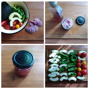 Как дополнение к стейк-салату, я замариную красный лук. Его можно не класть, но желающие могут его есть прямо из баночки. Луковицу нарезаем полу-кольцами, помещаем в баночку, наливаем бальзамический уксус 2 ст л и 1 ст л воды, кладём сахар. Закрываем крышкой и потрясём лук в банке. Лук можно тоже сделать заранее. Овощи нужно будет запечь на решётке без масла. Нарезать произвольно крупными дольками и выложить на решётку. Помидоры-черри кладём на решётку целыми. У меня они разной величины. Овощи нужно сделать аль-денте, чтобы они были чуть прихвачены, так они останутся сочными и хрустящими.